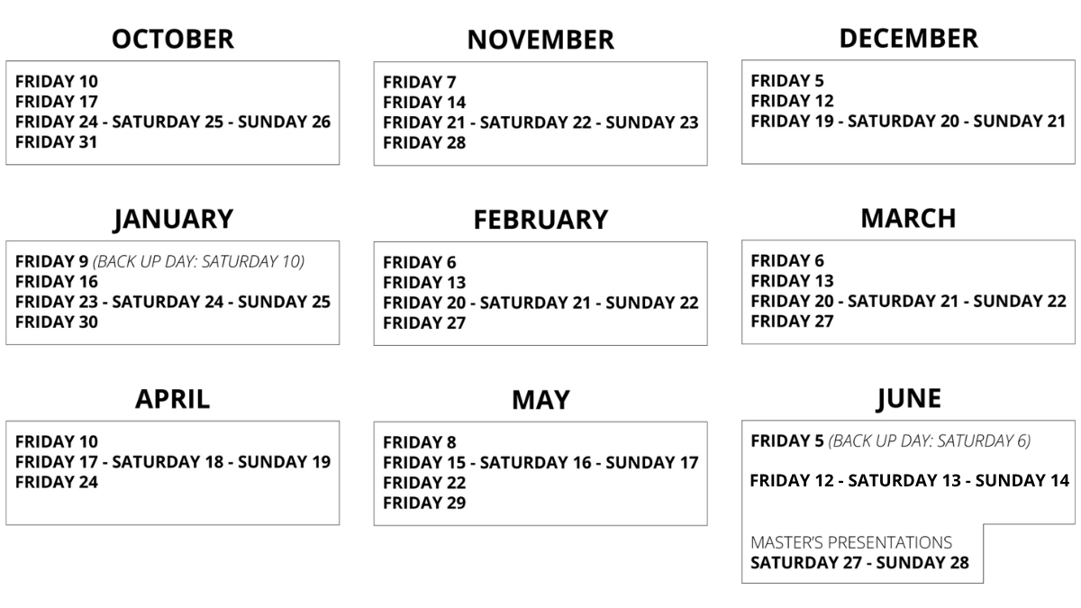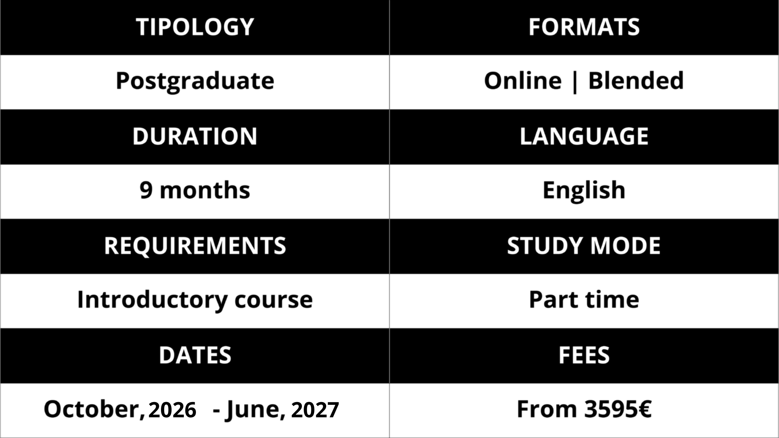 The program is offered in 2 different formats: online and blended. The online format is delivered entirely virtually, making it accessible to students worldwide. Classes are scheduled to accommodate various time zones, facilitating participation from both European and American students. The blended format entails in person classes one Saturday per month at our school in Barcelona.